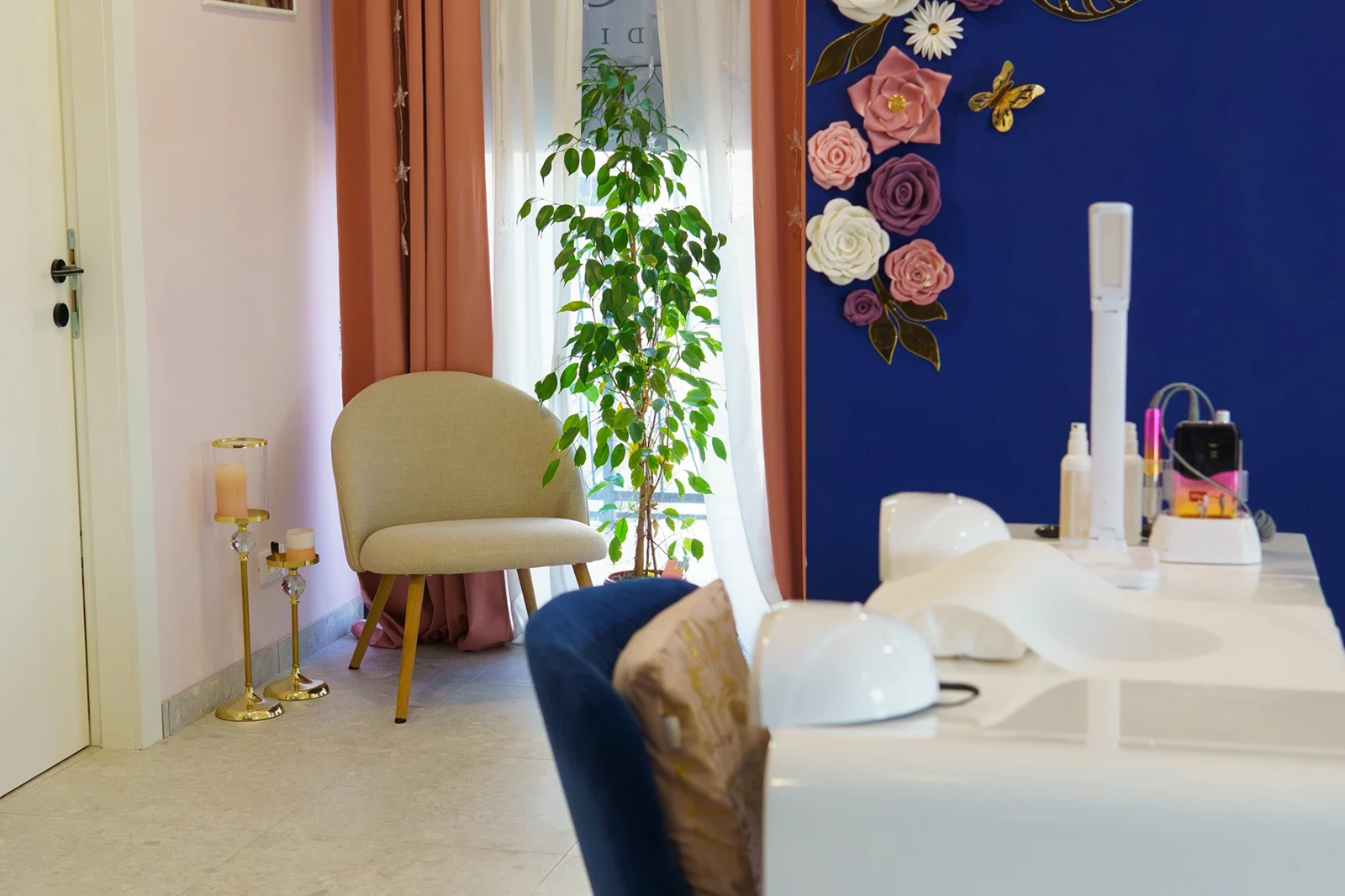 The waiting room was completed with final wall finishes and painted in a soft blue tone that complements the chosen furniture and the visual identity details of the salon.